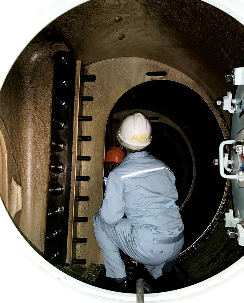 訪船期間,長城船用油技術工程師與輪機長溝通了船舶設備使用近況,交流了船用設備潤滑管理經驗,開展了掃氣箱檢查,進一步檢查確認發動機零部件使用情況,檢查結果顯示潤滑良好。
