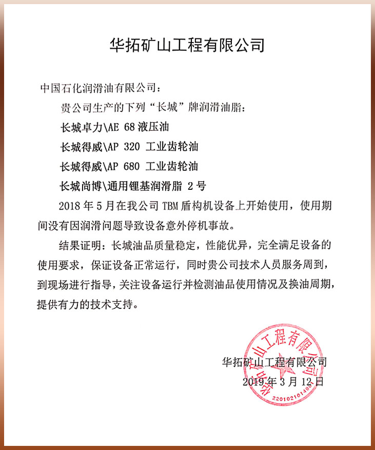長城潤滑油獲的華拓盾構(gòu)機(jī)應(yīng)用證明