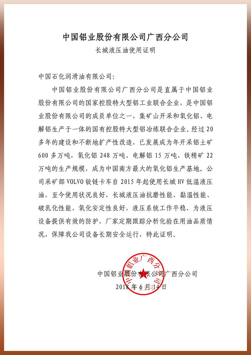 【液壓油】長城液壓油取得中鋁(廣西)沃爾沃鉸鏈卡車應用證明