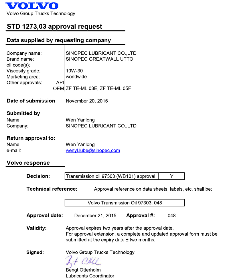 液壓傳動制動三用油獲得沃爾沃WB101認證