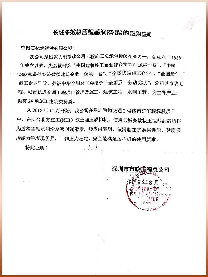 長城潤滑脂獲深圳市政工程總公司認證