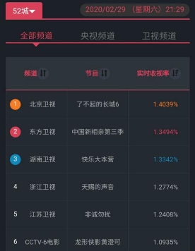 2月29日,第六期《了不起的長城》在北京衛視播出。繼第五期節目取得優異成績,本期節目再續輝煌,52城收視率達到1.40,并且奪得微博綜藝榜文化類綜藝TOP1,更是獲得了同時段綜藝節目收視率第一的好名次。節目中許多有趣好笑的片段以及有關長城的冷門知識點,接連登上熱搜榜單。