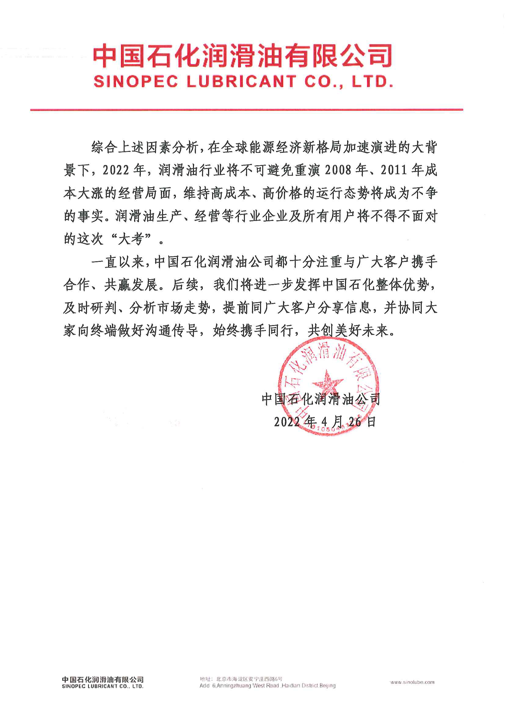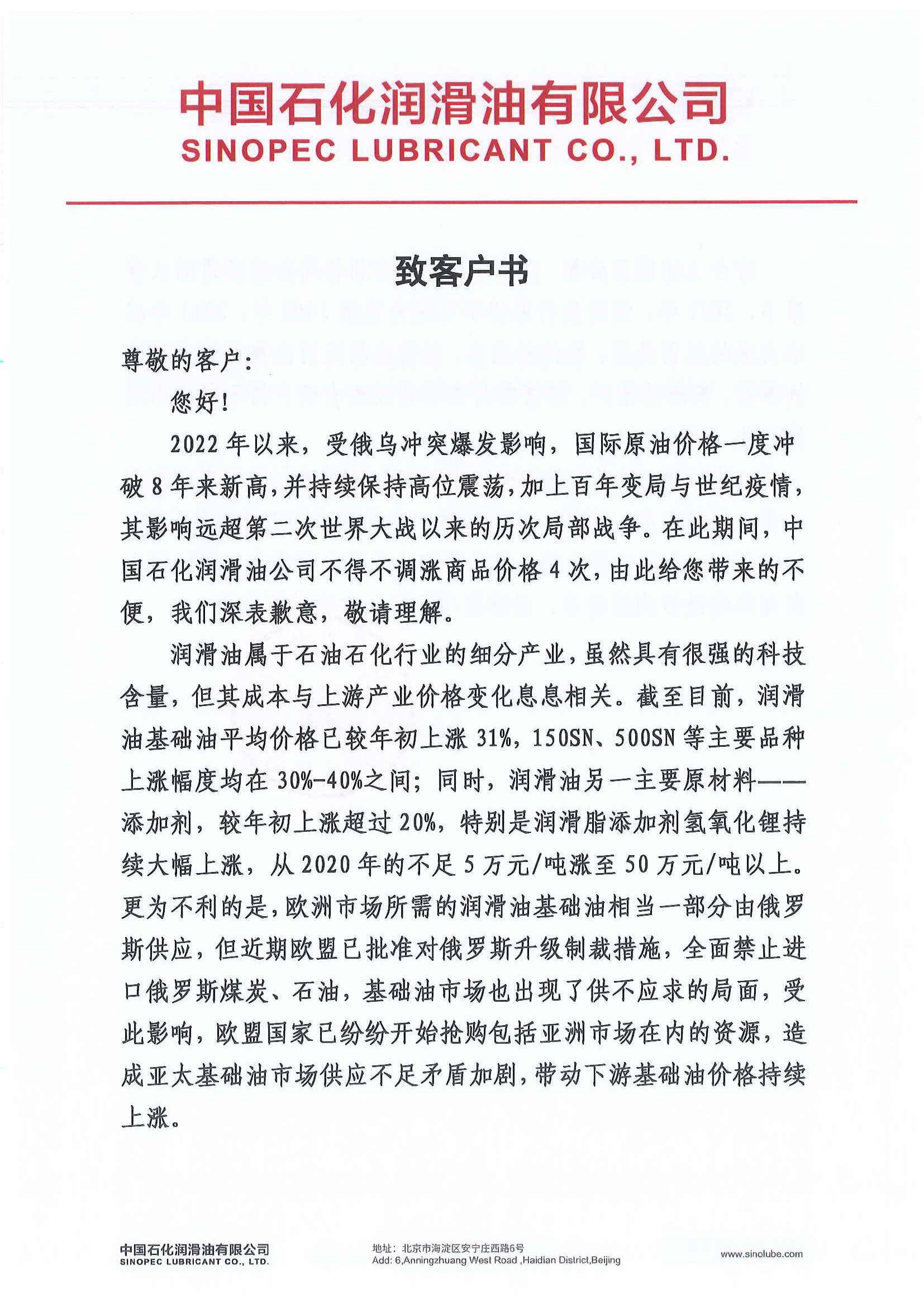 中國石化潤滑油有限公司致客戶書