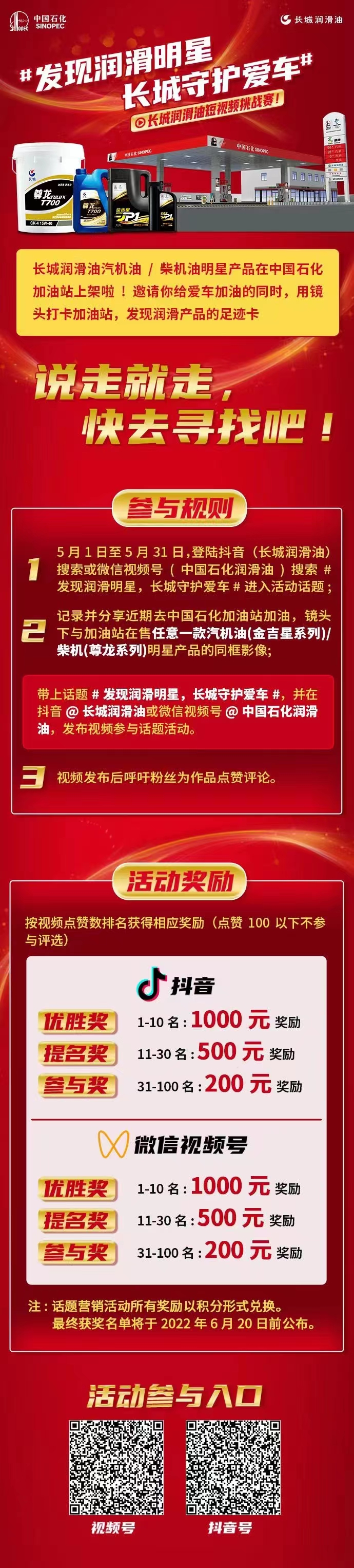 ? ? ? 即日起到5月31日,在中國石化加油站拍攝和長城潤滑油汽機油、柴機油明星產品同框視頻,就可參與比賽,就有機會獲得獎勵。