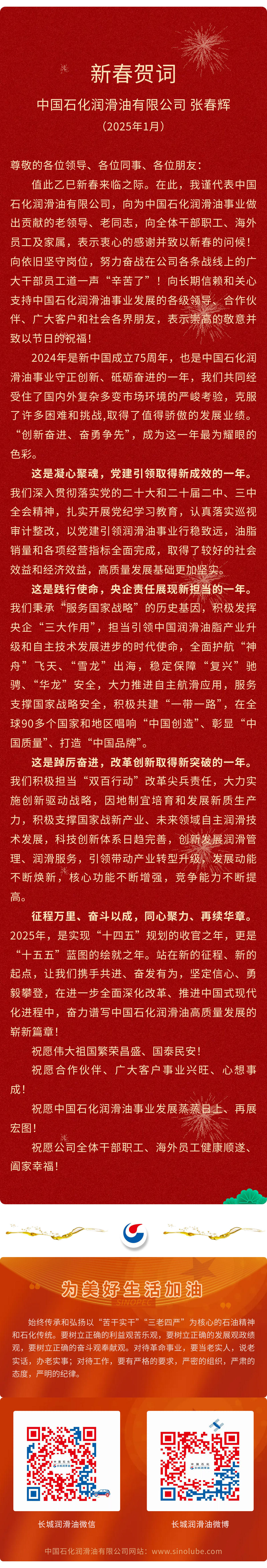 中國石化潤滑油有限公司總經理張春輝發表新春賀詞
